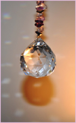Spheres are the classic crystal shape. They have many facets and scatter light around very effectively. All our crystals come complete with wire for hanging, and this particular model shows additional crystals that run up the wire. Available with mixed crystal chips or Rose quartz chips .
